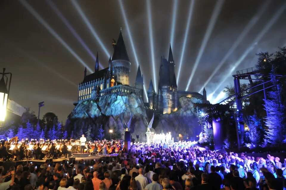 4. Dark Mark Projection: The sinister skull and snake symbol is projected onto landmark set pieces, including the exterior of Hogwarts Castle.