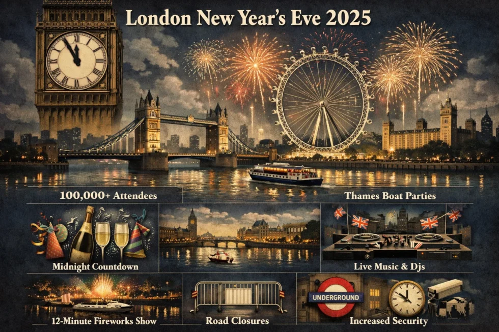 Emergency services now have guaranteed access corridors, stewards can regulate crowd density in real time, and police can prevent dangerous surges towards the river at midnight. This is why London New Year’s Eve 2025 is operated not as an open street party but as a major international event, with airport-style security perimeters, transport shutdowns and strictly controlled entry across central London.